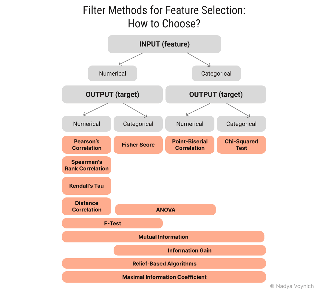The choice of statistical measures for filter feature selection is highly dependent upon on the type of input (feature) and output (target variable). Common types of variables are numerical and categorical. Thus, we can divide statistical measures for filter feature selection into four groups (scenarios).