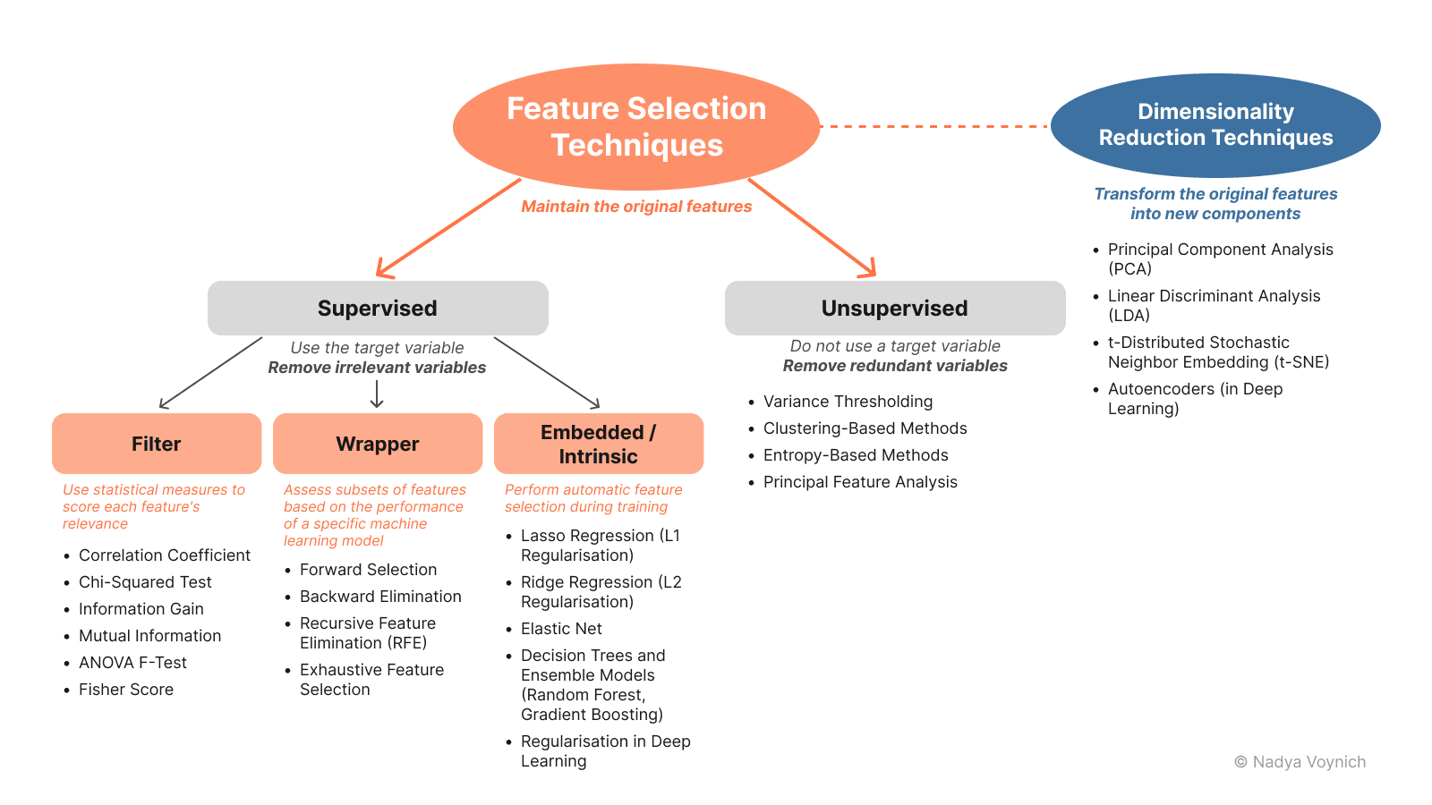 - Unsupervised: These methods do not use the target variable and instead focus on the intrinsic structure and relationships within the data. The objective is to remove redundant variables.
