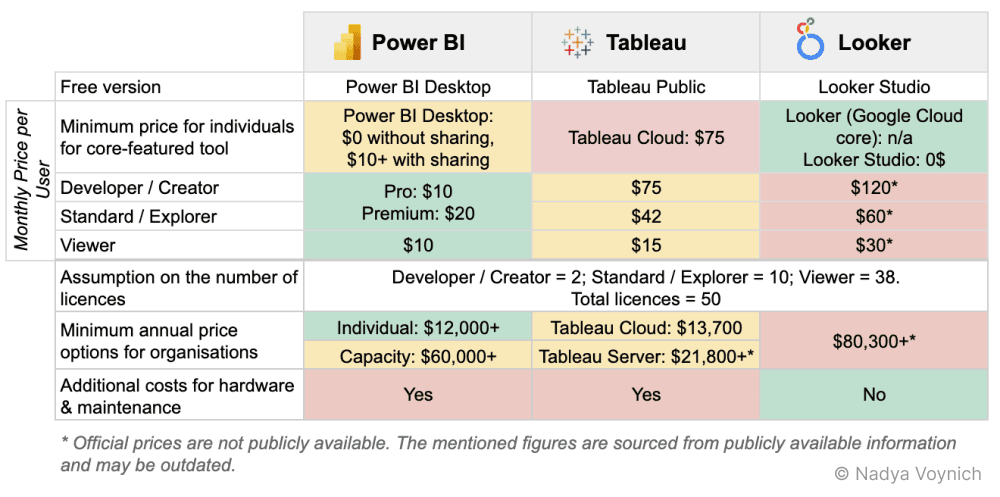 Thus, for individual professionals, Power BI and Looker Studio are the most cost-effective solutions.