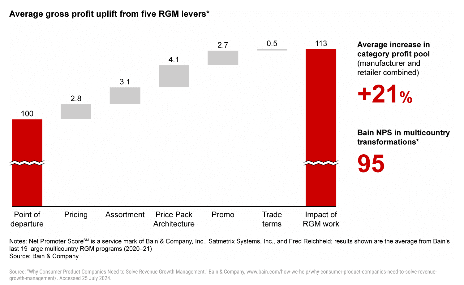 The chart below by Bain & Company demonstrates the impact of revenue management. According to Bain’s implemented RGM programs, companies have seen an average gross profit uplift of 13%, with an average increase in the category profit pool for both manufacturers and retailers reaching 21%.