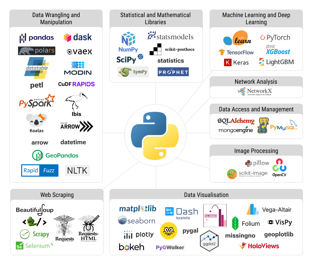 In order to better navigate the vast diversity of Python libraries, I have created a list of 60 the most widespread ones in the field and organised them into the following groups:
