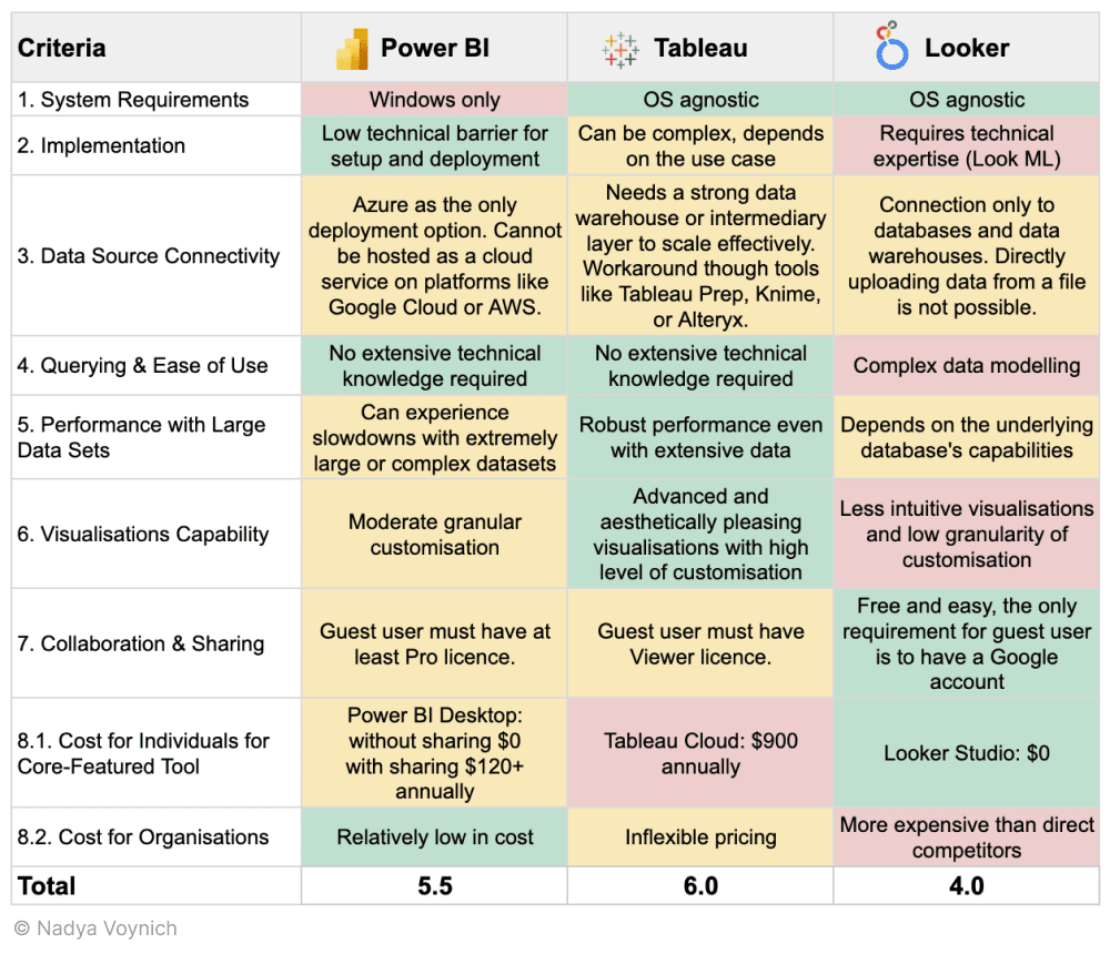 In summarising the Tableau vs. Power BI vs. Looker comparison, I used this scoring method: