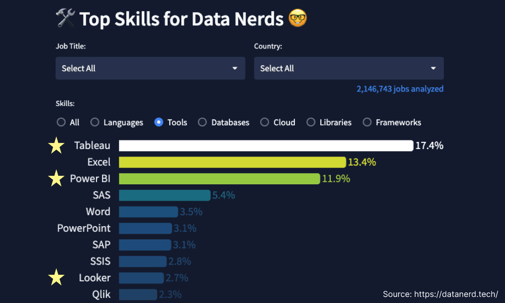 Gartner’s Magic Quadrant is a great way to understand the competitive landscape of BI tools, but what BI tools are in demand for data roles nowadays? To answer this question let’s refer to Luke Barousse’s app ”Top Skills & Pay of Data Nerds”, which offers valuable real-time analysis of skill requirements for Data Analysts, Data Engineers, and Data Scientists. This app analyses job postings collected daily from Google’s search results (~6500 jobs/day) from around the globe.