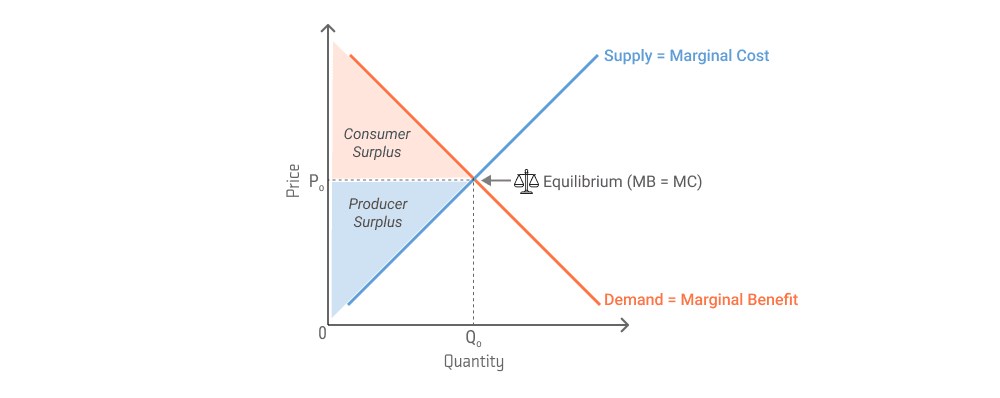 Both consumer surplus and producer surplus are economic terms used to define market wellness by studying the relationship between the consumers and suppliers. They explain the opportunity cost consumers forego to gain a marginal benefit (MB) for buying a good or service. To the producer, it is the willingness and ability to produce an extra unit of a product based on the marginal cost (MC) of producing more goods.