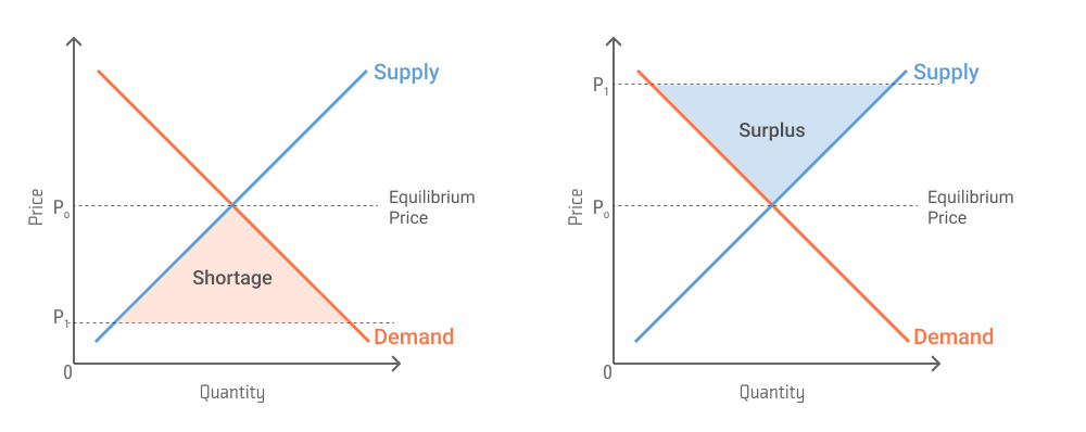 If the market price is above the equilibrium price, there will be a surplus of goods (excess supply), leading producers to lower prices to increase sales. Conversely, if the market price is below the equilibrium price, there will be a shortage of goods (excess demand), prompting producers to raise prices. These adjustments continue until the market reaches equilibrium.