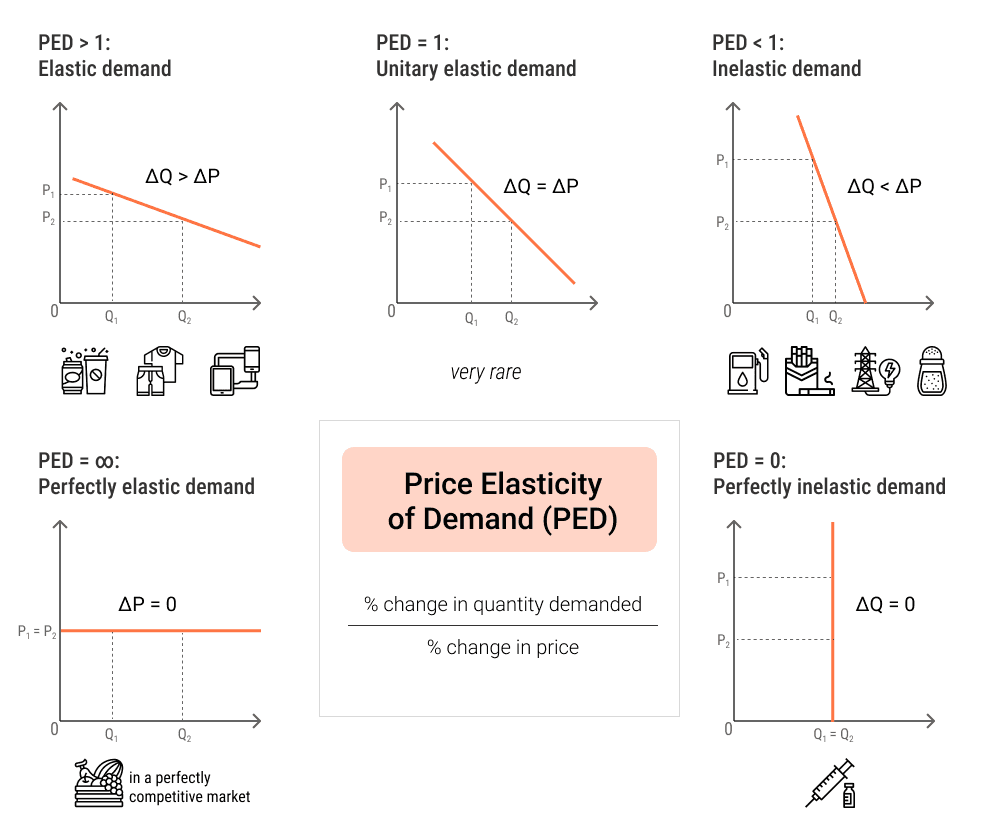 - Unitary elastic demand (PED = 1): When the percentage change in quantity demanded is exactly equal to the percentage change in price; this is very rare.