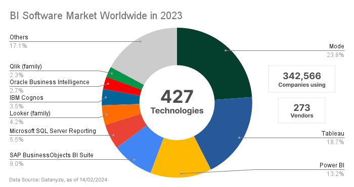 - Mode (or Mode Analytics, acquired by ThoughtSpot in 2023) has the top spot by market share with almost 24% and is followed by Tableau (18.7%) and Power BI (13.2%).