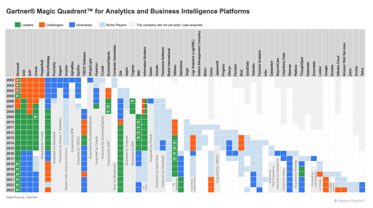 I haven't pinpointed the exact date when Gartner began evaluating the competitive landscape of these platforms. The earliest reference I encountered was in an article by Michael Mullany, a tech investor, board member, and advisor, dating back to 2002. The most recent Magic Quadrant is from January 2023. Therefore, reviewing the Magic Quadrants for BI platforms from 2002 to 2023 provides an excellent opportunity to understand the modern history of BI, offering insights into the evolving market positions of various BI software producers.