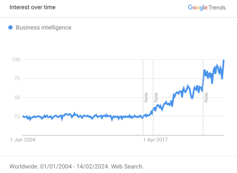 Business Intelligence (BI) has become an integral part of many organisations in today's data-driven world. BI enables the generation of insights, which improves performance and provides a competitive advantage. Google Trends reveals that since 2017, interest in business intelligence has surged significantly, and this trend continues to grow to this day.