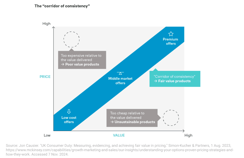 Simon-Kucher & Partners, regarded as the world’s leading consultancy specialising in pricing and growth, in August 2023 published a framework which they use to help their clients with price positioning. This framework is called the ‘corridor of consistency’.