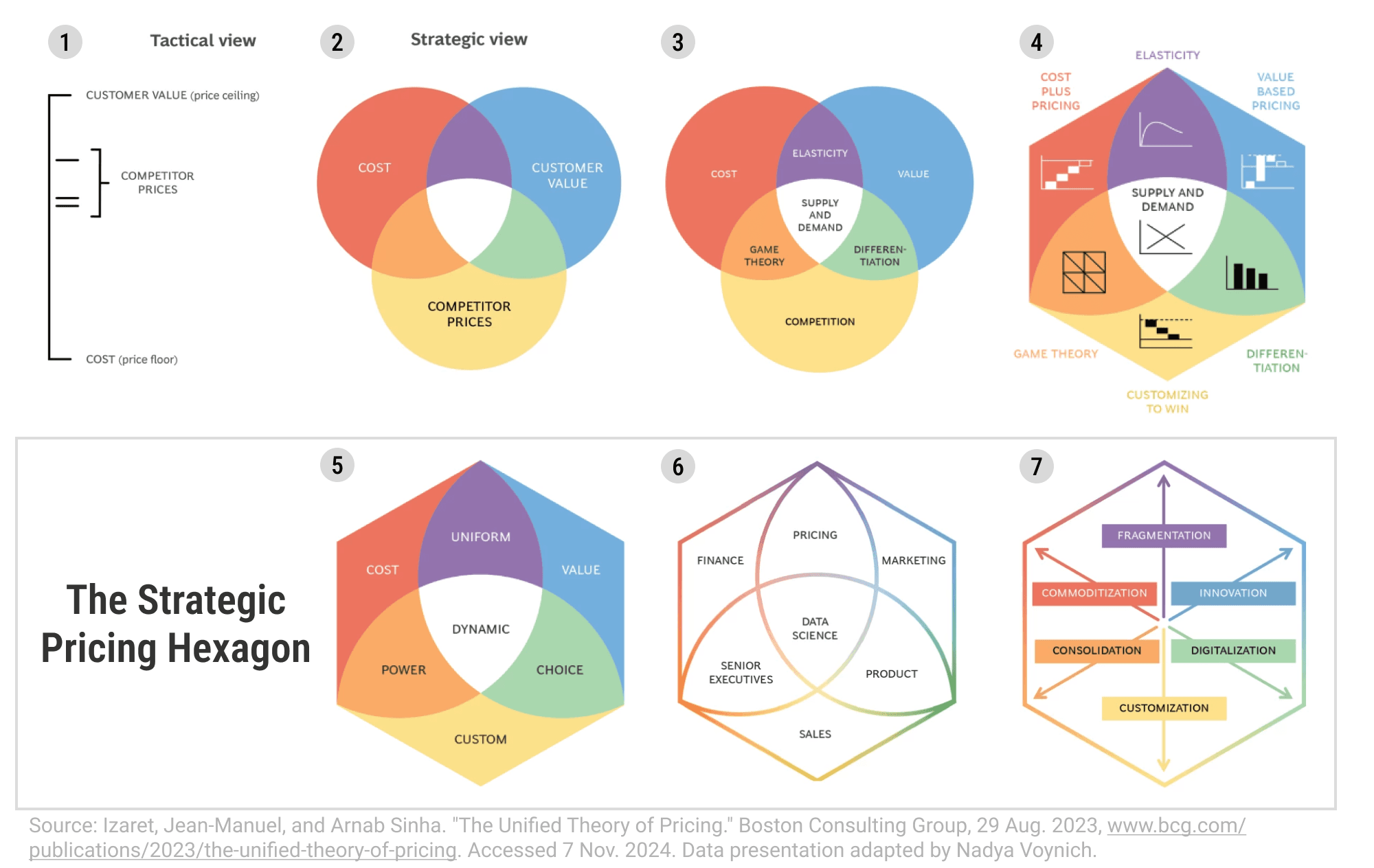 This effort resulted in the Strategic Pricing Hexagon (or the Strategy Hex) — a tool that consolidates various pricing concepts into a cohesive framework, helping business leaders craft effective pricing strategies. This framework was developed by BCG's managing directors and senior partners, Jean-Manuel Izaret and Arnab Sinha. Their book, Game Changer: How Strategic Pricing Shapes Businesses, Markets, and Society, provides a detailed explanation of this theory. In this article, I will focus on the key ideas and logic of their main tool, the Strategy Hex.